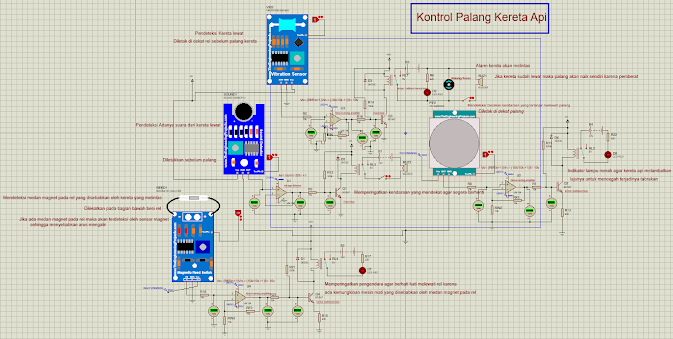 Dimulai dari sensor vibration, apabila kereta lewat dan sensor vibraton mendeteksi getaran dari kereta tersebut, maka logicstate berlogika 1, sehingga adanya arus yang mengalir dari power supply menuju ke Vcc, kemudian dikeluarkan berupa tegangan melalui kaki Vout, tegangan tersebut diumpankan ke R5, kemudian menuju ke Op-Amp di mana di sini Op-Amp bertindak sebagai non inverting, di mana terjadi penguatan sebanyak 2x dengan dengan Vout-nya dihitung dengan rumus V0 = (Rf/Rin +1) x Vin kemudian menuju R16 kemudian menuju ke base dengan tegangan yang cukup pada base sehingga transistor aktif dengan transistor aktif maka ada arus yang mengalir dari power supply menuju relay menuju kolektor menuju emitor terus ke ground ,jenis dari biasnya yaitu fixed bias dengan adanya arus tersebut maka nilai menjadi aktif dengan switch-nya berpindah ke kiri sehingga rangkaian loop menjadi tertutup dengan rangkaian loop tertutup maka arus dapat mengalir yang mengakibatkan LED-nya menjadi menyala dan palang akan turun serta buzzer akan berbunyi.